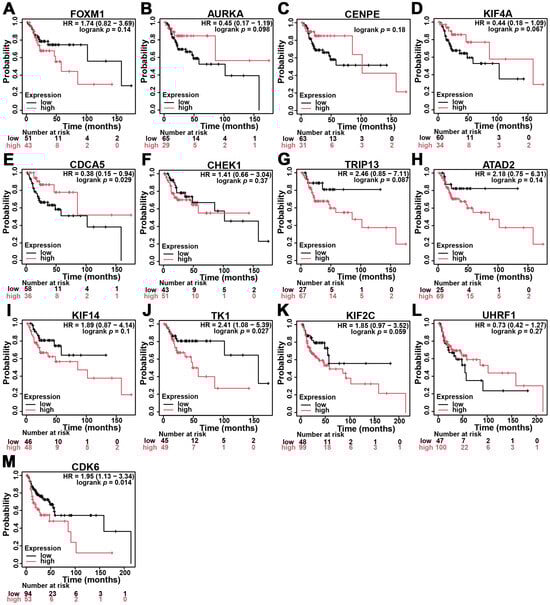 (A–M) Survival correlation of hub genes in HNSC. Kaplan–Meier plotter analysis of hub genes in stage II–III HNSC patients. Red represents higher expression, and black represents lower expression.