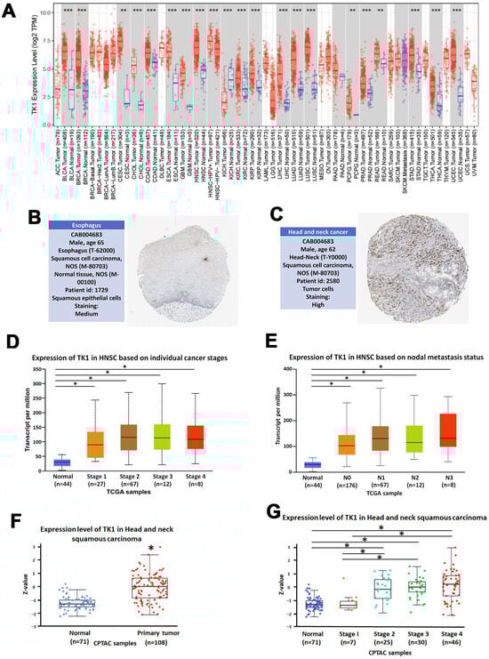 TK1 expression across cancers and stages. (A) TIMER2.0 analysis showing elevated TK1 expression across various cancer types. (B,C) IHC images from The Human Protein Atlas showing TK1 protein levels in normal and HNSC tissue. (D,E) TCGA data showing TK1 expression across clinical stages and lymph node grades. (F,G) CPTAC analysis reveals that TK1 protein levels in HNSC and cancer progression. * p < 0.05 compared to normal tissues, ** p < 0.01 compared to normal tissues, and *** p < 0.001 compared to normal tissues.