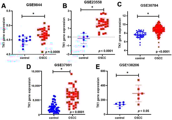 (A–E) Validation of TK1 expression in OSCC datasets. Dotplots of TK1 expression across OSCC samples and adjacent normal tissues from multiple GEO datasets, confirming consistent overexpression. * p < 0.05 compared to normal tissues.