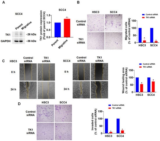 TK1 is associated with OSCC cell motility. (A) Western blot showing TK1 expression in parent SCC4 and high-mobility SCC4 sublines. (B) Transwell migration assay shows cell migration after siRNA-mediated TK1 silencing. (C) Wound healing assay shows the closure capacity in TK1-knockdown OSCC cells. (D) Transwell migration assay shows cell migration after siRNA-mediated TK1 silencing. * p < 0.05 compared to parent cell line and control siRNA.