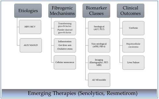 Interplay between etiology, mechanisms, diagnostic tools, and outcomes in liver fibrosis. HBV—hepatitis B virus; HCV—hepatitis C virus; ALD—alcohol-associated liver disease; MASLD—metabolic dysfunction-associated steatotic liver disease. Dark gray boxes indicate primary classification headers in the disease progression framework from cause to clinical manifestation; light gray boxes indicate subcategory items under each primary category and specific examples of biomarker classes. Lines connect subcategories to categories. The blue gradient box highlights the current focus on emerging therapeutic approaches that intersect with the biological and clinical components of the pathway. These therapies represent future interventions that can disrupt or modify these pathways at multiple stages.
