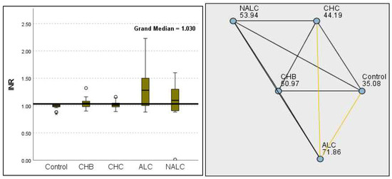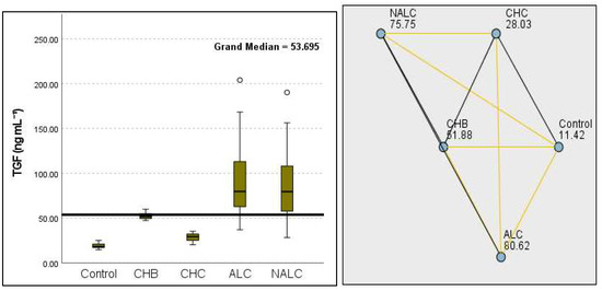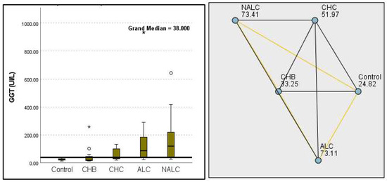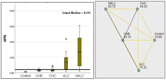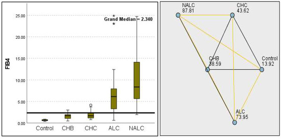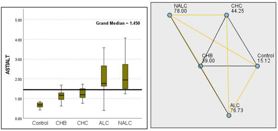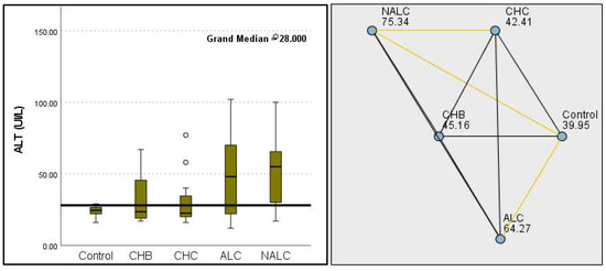 Comparison of the median of alanine aminotransferase (ALT UI/L) levels across control, CHB, CHC, ALC, and NALC groups using Kruskal–Wallis analysis of variance (ANOVA; p < 0.05 (right)), followed by pairwise-comparison post hoc tests (left). The cut-off line is set as the median reference.