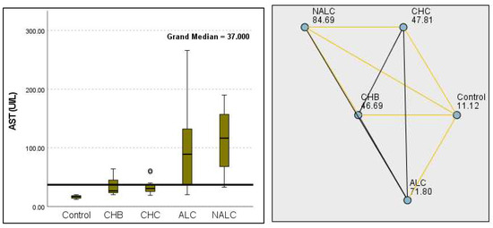 Comparison of median of aspartate aminotransferase (AST UI/L) levels across control, CHB, CHC, ALC, and NALC groups using Kruskal–Wallis analysis of variance (ANOVA; p < 0.05 (right)), followed by the pairwise-comparison post hoc tests (left). The cut-off line is set as the median reference.