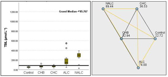 Comparison of the median of TBIL (total bilirubin µmol L−1) levels across the control, CHB, CHC, ALC, and NALC groups using Kruskal–Wallis analysis of variance (ANOVA; p < 0.05 (right)), followed by pairwise-comparison post hoc tests (left). The cut-off line is set as the median reference.