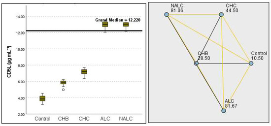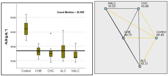 Comparison of the median of ALB (albumin g dL−1) levels across control, CHB, CHC, ALC, and NALC groups using Kruskal–Wallis analysis of variance (ANOVA; p < 0.05 (right)), followed by pairwise-comparison post hoc tests (left). The cut-off line is set as the median reference.