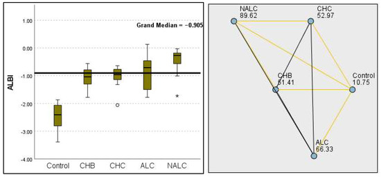 Comparison of the median of ALBI scores across control, CHB, CHC, ALC, and NALC groups using Kruskal–Wallis analysis of variance (ANOVA; p < 0.05 (right)), followed by pairwise-comparison post hoc tests (left). The cut-off line is set as the median reference.