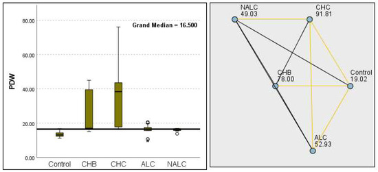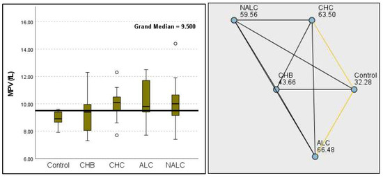 Comparison of the median of PLT (number of platelets in 109 L−1) levels across control, CHB, CHC, ALC, and NALC groups using Kruskal–Wallis analysis of variance (ANOVA; p < 0.05 (right)), followed by pairwise-comparison post hoc tests (left). The cut-off line is set as the median reference.
