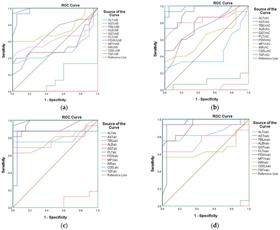 This study employed direct serological tests to quantify class I biomarkers associated with hepatic injury, which included the following: alanine aminotransferase (ALT), aspartate aminotransferase (AST), albumin (serum), gamma-glutamyl transpeptidase (GGT), total bilirubin, platelet count (PLT), international normalized ratio (INR), platelet distribution width (PDW), mean platelet volume (MPV), CD5 antigen-like (CD5L), and transforming growth factor-beta 1 (TGF-β1). The values of the parameters investigated were taken from the medical records of the patients included in this study, except for CD5L/TGF-β1, which was measured prospectively. Discriminatory values were present between groups rather than definite diagnoses.