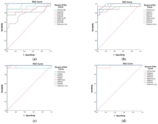 Seven indirect class II biomarkers associated with fibrogenesis and cirrhosis were employed as indirect serological tests: the AST-to-platelet ratio index (APRI), fibrosis-4 index (FIB-4), albumin–bilirubin (ALBI) score, gamma-glutamyl-transpeptidase-to-platelet ratio (GPR), AST/ALT ratio (De Ritis ratio), INR-to-platelet ratio (INPR), and fibrosis quotient (FibroQ). The results are reported as means ± standard deviations and relative to the minimum–maximum range. The following biomarker formulas were applied: