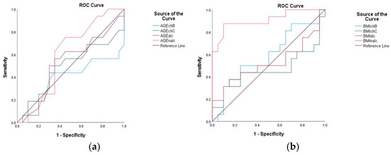 ROC curve analyses were employed to evaluate the discriminative performance of biomarkers and predictive models, quantifying the trade-off between sensitivity (true positive rate) and specificity (1—false positive rate) across different classification thresholds. The area under the curve (AUC) served as the primary metric, with the values interpreted as follows: (1) AUC = 1.0: perfect discrimination; (2) AUC = 0.5: no discriminative capacity (equivalent to random chance).