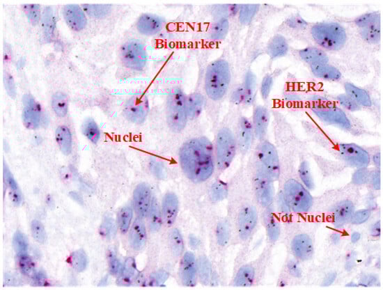 A total of 20 HER2-SISH whole slide images (WSIs) were obtained from breast cancer biopsy cases at the University of Malaya Medical Center (UMMC), comprising 8 HER2-amplified and 12 non-amplified cases. The biopsy samples were stained using the SISH protocol and scanned using a 3DHistech Pannoramic DESK scanner, producing high-resolution WSIs with dimensions ranging from pixels. From each WSI, expert pathologists selected five regions of interest (ROIs), resulting in 100 ROIs in total. The ROI dimensions varied from 859 × 755 to 5451 × 3136 pixels. Figure 4 illustrates an example ROI following stain normalization, and Table 2 summarizes the dataset characteristics.