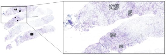 Figure 2. Visualization of selected regions of interest (ROIs) on a HER2-SISH whole-slide image (WSI) using the Cytomine platform. The black squares indicate expert-selected ROIs, where our fine-tuned Stardist model is applied for nuclei segmentation. This workflow enables pathologists to select ROIs on WSIs interactively, allowing real-time nuclei segmentation and accelerating the HER2 scoring process. - Demonstrating the model’s effectiveness for automatic nuclei detection in complex SISH images, thereby supporting pathologists in HER2 assessment and scoring.