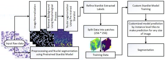 Several deep learning methods have been proposed for nuclei segmentation, often utilizing two-class probability maps followed by post-processing. For instance, ref. [18] introduced CNN-3C, which reframes nuclei segmentation as a three-class problem, achieving promising results across multiple organ types. Cui et al. proposed a fully convolutional network-based method for nuclei segmentation [19], while [20] formulated the task as a regression problem by predicting nuclei distance maps. Ref. [21] demonstrated that fusing networks led to better segmentation results compared to multi-task learning. Salvi et al. introduced a multi-scale adaptive nuclei segmentation (MANA) method, showing strong performance on multi-organ nuclei segmentation [22]. Recent work such as Xu et al. [23] explored transformer-based nuclei segmentation with improved generalization across staining variations. Similarly, Huang et al. [24] proposed a Multiscale CNN Transformer approach, showing strong results across nuclei segmentation. Despite these advancements, these methods often remain limited by the availability of sufficiently large, annotated datasets and the diversity needed to generalize across tissue types.