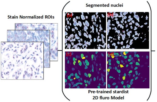 Recently, ref. [28] assessed Stardist in segmenting nuclei in CellSearch images, specifically in peripheral blood and DLA samples. Their study highlighted significant improvements in segmenting CellSearch images, resulting in more accurate counts of circulating tumor cells (CTCs). These findings emphasize Stardist’s potential for nuclei localization using star-convex polygons, making it a promising tool for advanced histopathology analysis, including applications in HER2-SISH images.