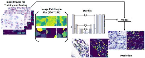 Our proposed framework was implemented on the Google Colab platform using TensorFlow [33]. The custom Stardist model employed in the two-stage framework was trained with a learning rate of , optimized using a stochastic gradient descent optimizer to minimize the loss function. The batch size was set to 4, with a momentum of . To optimize memory usage and enhance training efficiency, particularly given GPU constraints, the input image size was fixed at 256 × 256. During training, we augmented the dataset by applying random rotations, horizontal flips, and vertical flips. The model was trained for 100 epochs, with a total runtime of approximately 2 h on the Colab environment. While our approach is versatile and not limited to specific regression or classification models, we adopted Stardist, which is built on the U-Net architecture [34], as the basis for our model.