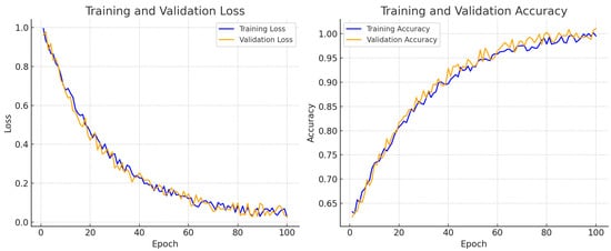 Figure 8 illustrates the simulated training and validation loss and accuracy curves over 100 epochs, reflecting the convergence behavior of the fine-tuned Stardist model.