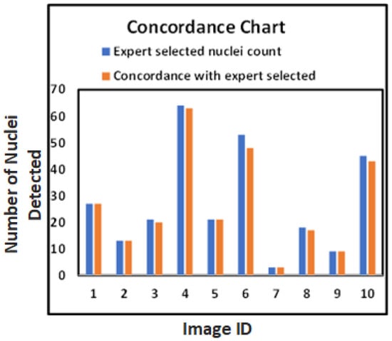 These metrics provide a comprehensive assessment of the model’s performance in detecting nuclei. Figure 9 visualizes the model’s performance, demonstrating that our approach closely aligns with expert-marked nuclei regions and visually identified nuclei without classification.