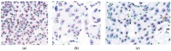 Visualization of nuclei detection results in HER2-SISH image samples. Subfigures (a–c) present three different HER2-SISH image patches with overlapped and clustered nuclei regions, highlighting detection results. In each image, red dots indicate expert-targeted nuclei used for diagnosis, green “x” marks represent model-detected nuclei, black “x” marks indicate missed nuclei, and red bounding boxes highlight oversegmented regions.