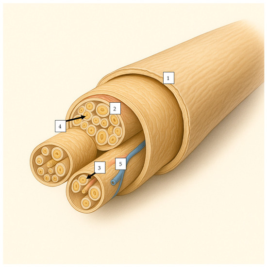 Figure 1. The overall structure of a nerve, containing (1)—an outer layer (epineurium), encasing the nerve, (2)—an intermediary layer (perineurium), encasing multiple nerve fibers, and (3)—an inner layer (endoneurium), encasing each nerve fiber (4). Within the nerve fiber are present nutritional vessels (5).