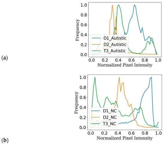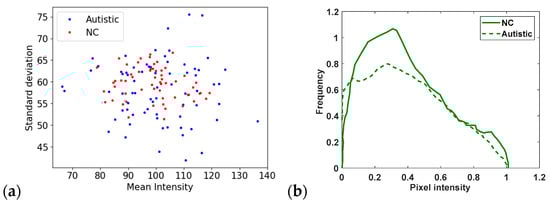 Examining the average brightness and the spread of pixel intensities reveals that the data distributions of the ASD and NC groups differ from one another, as seen in Figure 1a. The distributions of normalised pixel intensities are then shown in Figure 1b. Despite significant overlap, the prominent peaks of these distributions differ between the two groups. These results suggest that the facial characteristics of individuals with ASD and NC differ slightly but noticeably. Consequently, it may be challenging for traditional image analysis tools to reliably distinguish between these groups, underscoring the potential for more sophisticated techniques, such as deep learning, to enhance classification accuracy. Interestingly, the ASD samples display a wider range, suggesting more variability in their visual appearance, while the NC samples display a more consistent and concentrated average brightness.