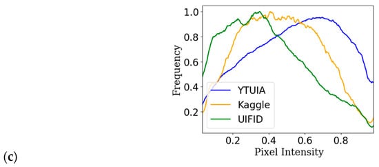 Figure 2 visualises the domain shift in the image features extracted from the facial image datasets, including Kaggle, YTUIA, and UIFID, used for autism spectrum disorder (ASD) classification. When we look at Figure 2a,b, we can see the distribution of pixel brightness for the ASD and NC samples in each of our datasets. The distinct peaks in these figures indicate variations not only between the ASD and NC groups, but also between the datasets themselves, suggesting significant differences related to both the class (ASD vs. NC) and the data source. Figure 2c, which combines all samples, further underscores these domain shifts in pixel brightness distribution. Notably, UIFID tends towards lower pixel intensities, while YTUIA and Kaggle have a more balanced distribution. These visual patterns highlight the challenges faced in obtaining an ASD classification [14].