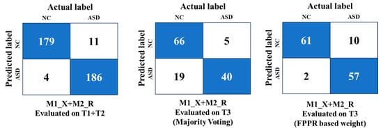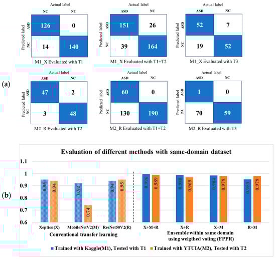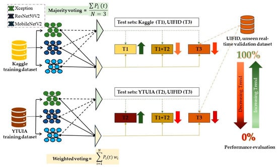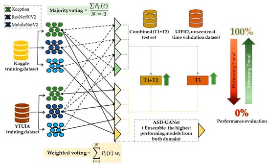 To address the challenges of classifying autism spectrum disorder (ASD) from varied facial images and improve diagnostic robustness, this study implemented deep ensemble learning strategies. As discussed in Section 2, these approaches are adept at combining diverse data patterns and enhancing model generalisation across different clinical scenarios and demographics. By facilitating knowledge transfer across domains, ensemble models trained on diverse datasets improve the diagnostic performance of ASD in various settings and demographics [43]. Two ensemble strategies—majority voting and weighted voting—were employed in this study to enhance model performance and generalisation across domain-specific datasets.