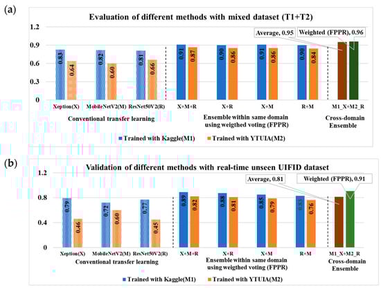 Figure 4 and Figure 5 display the ensemble results for same-domain and cross-domain scenarios, respectively. In both figures, the green dashed line represents the majority voting mechanism, while the solid light yellow line indicates the weighted voting scheme. These visualizations clearly demonstrate that both voting methods contribute to enhancing prediction accuracy.