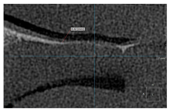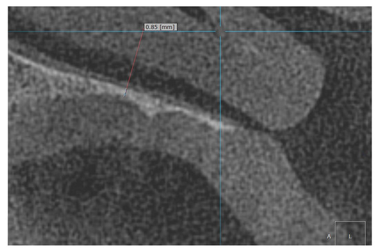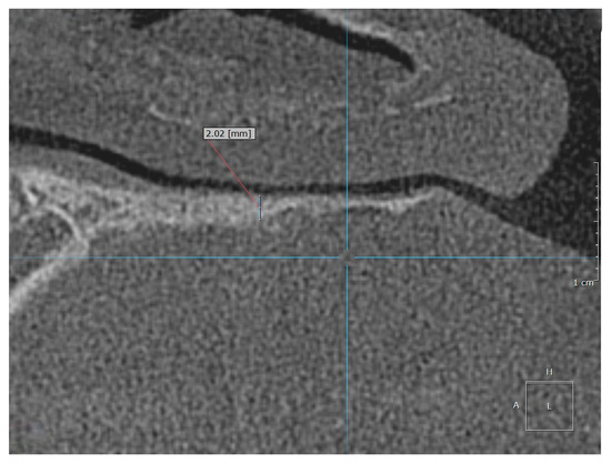 The DXA T-score approach was applied in a similar way to the WHO for osteoporosis, which allows the comparison of young and healthy persons with older pathologic patients. Both groups were selected from the same pool, without additional selection criteria, which was in line with the WHO’s approach to minimizing other dependencies. Of course, the known impact factors and dependencies for osteoporosis are valid here as well; therefore, a specific verification of all the possible impacts was not part of this pilot study. All patients with a osteopenia/osteoporosis DXA diagnosis had a thickness in their hard palate (max. 0.9 mm). In contrast, all patients in the control group and all patients with normal DXA had a thickness of at least 0.9 mm. Considering a measurement fault of ±5% (±10%), and, if we draw the cutoff line at 0.9 mm, we can define an HPT grey area with false negative or false positive results as between 0.855–0.945 mm (0.81–0.99 mm). For the grey area or the error of measurement, it can be treated the same as for the normal or pathologic groups. The main reason is that absolute measurements are less accurate than relative measurements. In this sense, it might be necessary to adapt the criteria individually. Of course, the individual error of the HPT measurement can be different, mainly because of the accuracy and having to find the right measurement location. It would be good to recommend that the HPT measurement point is included in the CBCT by default—the benefit seems to outweigh the consideration of the effective doses [46]. The measurement of the defined measurement point itself also proved to be difficult, as disruptions were present from illnesses of the teeth or maxillary sinuses in a considerable number of patients. A further difficulty was that the hard palate often was not imaged in the CBCT for reasons of radiation protection, for example, in the CBCT before dental implants in the lower jaw. Should further studies show that the HPT is suitable for the diagnosis of osteoporosis, an alteration in the procedure would be advisable for patients at risk of this disease.