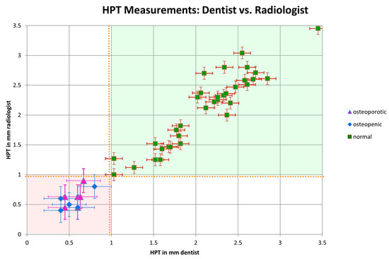 HPT measurements of the dentist in comparison to the radiologist in mm, including pathologic (light red: osteoporosis/osteopenia) and normal (light green) areas.
