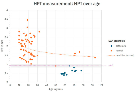 The DXA results were used as for the diagnoses of the pathologic patients in the DXA group. According to the WHO, the T-scores represent numbers that compare the condition of an older person’s bones with those of an average young person with healthy bones (meanWHO). A young person here means healthy 25- to 35-year-old adults. The T-score of x is meanWHO −x SD. The T-score categories were a T-score ≥ −1 indicated normal bone density; a T-score between −1 and −2.5 indicated low bone mass—osteopenia; and a T-score ≤ −2.5 SD indicated the presence of osteoporosis [5,6]. The WHO approach to T-scores was applied in an analogous way to HPT measurement. According to the WHO, the T-score definition of bone density measurement > meanWHO −1 SD, indicates normal bone density. Applied to the HPT measurement results in the HPT measurement values, ≥ meanHPT −1 SD indicated normal bone density. The HPT measurement values < meanHPT −1 SD and > meanHPT −2.5 SD, indicated low bone mass. HPT measurement values ≤ meanHPT −2.5 SD indicated the presence of osteoporosis. Since this pilot study was about finding an early indicator for osteoporosis, the more important classification, HPT measurement values = meanHPT −1 SD, was used as a cutoff between normal bone density and low bone mass and the risk of osteoporosis. From here, an HPT cutoff value or line was derived to distinguish between normal and suspected osteoporosis.