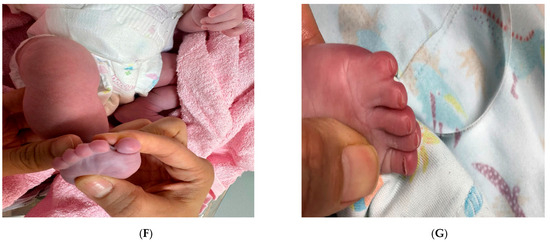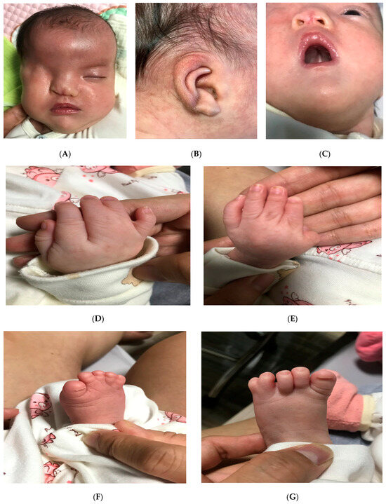 However, the neonate was observed to have abnormal morphology. Unilateral cryptophthalmos and cleft palate were noted postnatally. In addition, the neonate presented with abnormalities of the extremities, consisting of partial III-IV-V finger membranous syndactyly on the right hand, partial II-III-IV finger membranous syndactyly on the left hand, and complete II-III-IV-V foot membranous syndactyly on the right side, and complete IV-V membranous syndactyly on the left side. The face was dysmorphic, with marked hypertelorism, a depressed nasal bridge, dysplastic ears, and low-set ears (Figure 1A–G). The rest of the systemic examination was unremarkable.