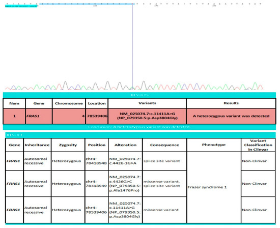 Findings showing the heterozygous variation of the FRAS1 gene of the newborn. FRAS1: Fraser extracellular matrix complex subunit 1; chr: chromosome.