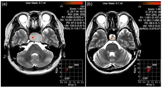 Region of interest (ROI) measurement for pituitary adenoma (PA) and Rathke’s cleft cyst (RCC) using magnetic resonance imaging compilation (MAGiC) image. The ROI was placed on PA (a) and RCC (b), and T1 and T2 relaxation rates were calculated.