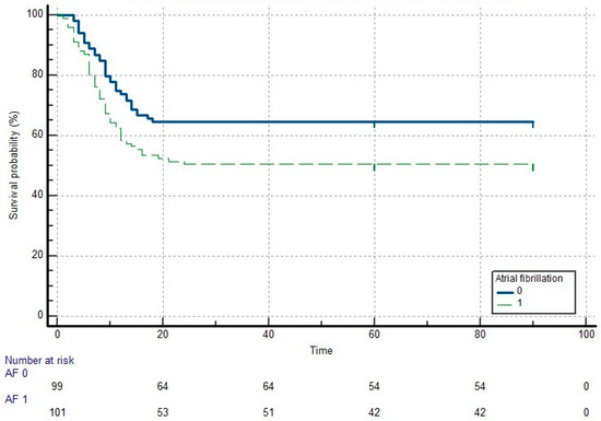 Kaplan-Meier survival curve for patients with and without atrial fibrillation.