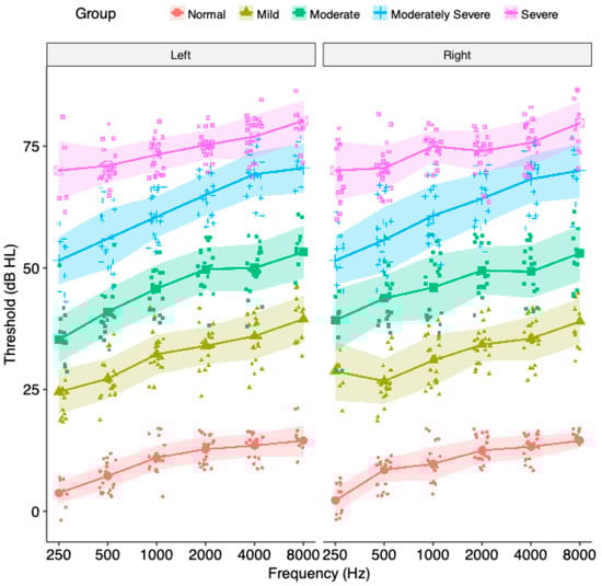 One hundred individuals aged 30–40 years volunteered for this study. Participants were divided into five groups (n = 20 subjects per group) based on their hearing threshold levels (HTL). All selection criteria adhered to diagnostic standards, ensuring sample representativeness for clinical populations. HTL was determined using pure tone audiometry across frequencies from 250 to 8000 Hz (octave bands) following the modified Hughson-Westlake procedure []. According to the ANSI classification system, participants were categorized as having normal hearing or varying degrees of hearing loss []. Group 1 subjects had pure tone average (PTA) threshold for 500, 1000, 2000, and 4000 Hz test frequencies ≤ 15 dB HL (normal hearing-reference group), Group 2 subjects had PTA between 26 and 40 dB HL (mild hearing loss), Group 3 subjects had PTA between 41 and 55 dB HL (moderate hearing loss), Group 4 subjects had PTA between 56 and 70 dB HL (moderately severe hearing loss), and Group 5 subjects had PTA between 71 and 90 dB HL (severe hearing loss). Subjects with PTA between 16 and 25 dB (minimal hearing loss) were not included in this study. They were randomly selected from our audiology outpatient department (OPD). Group 1 consisted of individuals accompanying patients, while Groups 2–5 comprised patients visiting the OPD. All selected subjects had binaurally symmetrical hearing with an air-bone gap (ABG) ≤ 10 dB HL at all frequencies. Hearing symmetry was defined as: (a) ≤20 dB difference at any single frequency, (b) ≤15 dB difference at any two adjacent frequencies, and (c) <10 dB difference in PTA at 500, 1000, 2000, and 4000 Hz. All subjects had an uncomfortable loudness level (UCL) > 110 dB HL, measured using recorded speech via the audiometer. Subjects with abnormal loudness growth at suprathreshold levels were excluded. Exclusion criteria were established to ensure the homogeneity of the study sample and minimize confounding variables. The mean hearing thresholds of each group of subjects are shown in Figure 1.