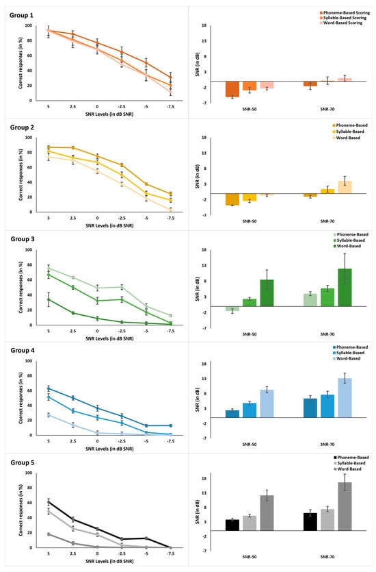 Figure 2 (left panels) shows that performance (% correct identification) decreases as SNR decreases across all scoring types, with similar trends observed in all five groups. Correct response percentages were highest for phoneme-based scoring and lowest for word-based scoring. Figure 2 (right panels) presents the SNR-50 and SNR-70 values for phoneme, syllable, and word-based scoring by group. SNR-50 and SNR-70 were lowest for phoneme-based scoring and highest for word-based scoring. Error bars represent ± 1 standard deviation.