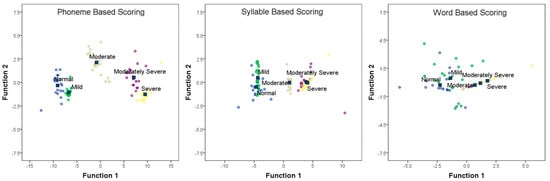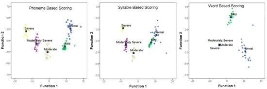 Discriminant function analysis assessed the ability of different scoring systems to predict hearing loss severity, with scores at each SNR level as independent variables and group distribution as the dependent variable. Phoneme-based scoring correctly classified 100% of subjects. Four functions were generated; Function 1 explained 94.3% of the variance, while Functions 2, 3, and 4 explained 3.9%, 1.2%, and 0.6%, respectively. Figure 3 (left panel) shows the canonical discriminant function graph, indicating the distinct separation of groups with no overlap, demonstrating phoneme-based scoring’s effectiveness in distinguishing degrees of hearing loss. Syllable-based scoring classified groups with 98% accuracy, with Function 1 explaining 91.9% of the variance. Figure 3 (middle panel) shows some overlap between normal and mild groups, with minor misclassifications, indicating syllable-based scoring’s high accuracy in distinguishing higher degrees of hearing loss but less efficiency between normal and mild hearing loss. One subject with normal hearing was labeled mild, and one with mild loss was labeled normal in the model. Word-based scoring classified groups with 71% accuracy, with Function 1 explaining 83.5% of the variance. Figure 3 (right panel) indicates a high overlap between moderate, moderately severe, and severe hearing loss groups, demonstrating word-based scoring’s efficiency in distinguishing normal and mild hearing loss but poor discrimination for other degrees of hearing loss. Six subjects with moderate hearing loss were identified as moderately severe, and two were labeled severe in the model. Similarly, five subjects with moderately severe hearing loss were identified as moderate, and eight as having severe hearing loss. Two with severe hearing loss were also labeled as moderate, and six as having moderately severe hearing loss in the model.