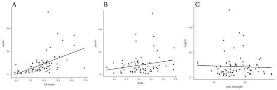In the correlation analysis, leptin levels were significantly correlated with fat-related parameters such as BMI (r = 0.360, p = 0.011) and total fat percentage (r = 0.413, p = 0.003) (Table 3, Figure 1). However, leptin was not significantly correlated with skeletal muscle mass (ASM) (r = 0.135, p = 0.354) or grip strength (r = −0.059, p = 0.686). A positive but non-significant correlation was observed between leptin levels and femur neck BMD (r = 0.195, p = 0.084).