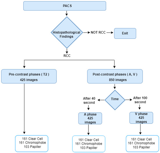 RCC is divided into three main subtypes based on histopathological features: clear cell renal cell carcinoma (ccRCC), papillary renal cell carcinoma (pRCC), and chromophobe renal cell carcinoma (chRCC). Clear cell RCC (ccRCC) is the most common type, accounting for 75% of all cases. This subtype is particularly aggressive and has a poor prognosis [4]. After clear cell carcinoma, the most common subtypes are papillary and chromophobe. Abdominal imaging is an important diagnostic tool for the detection and characterization of renal tumors. The widespread use of cross-sectional imaging techniques has led to significant progress in the detection of renal tumors. Computed tomography is the most commonly used screening method due to its short scanning time. MRI has many advantages over CT. It can be used for the initial diagnosis and staging of RCC. Radiation-free MRI provides high soft tissue contrast that visualizes the tumor’s internal structure or components. Due to soft tissue similarity, it is quite difficult to distinguish RCC subtypes with MRI alone [5]. To overcome this challenge, different MRI phases are analyzed. ccRCC lesions, due to their hyper-vascular nature, exhibit heterogeneous and intense enhancement relative to the renal parenchyma following contrast administration. They show marked enhancement in the corticomedullary phase and demonstrate washout in the nephrographic phase. In contrast, pRCC lesions display minimal, slow, and progressive enhancement, with less contrast uptake compared to renal parenchyma in the corticomedullary phase. Meanwhile, chRCC lesions, being hypo-vascular, show lower enhancement than ccRCC but greater than pRCC after contrast administration. In this study, the corticomedullary phase was denoted as “A,” and the nephrographic phase as “V”.