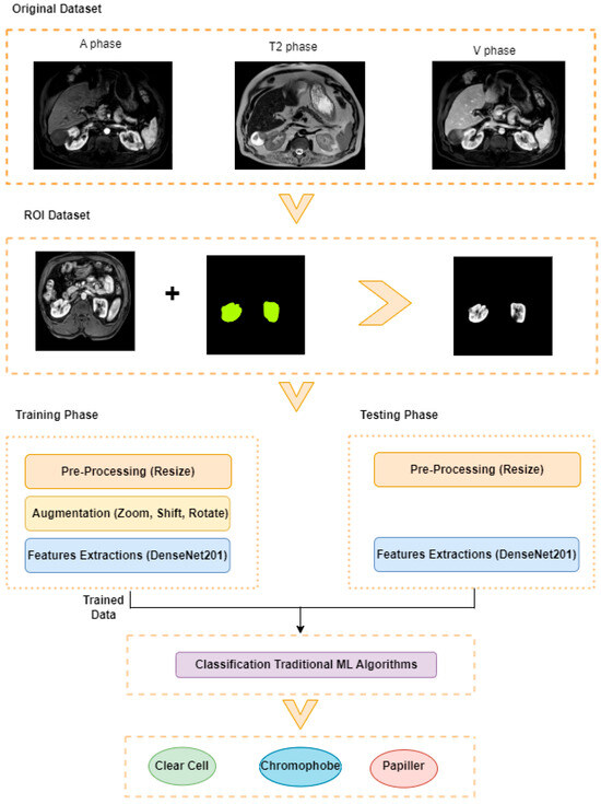 This study aims to determine the subtypes of kidney tumors using data obtained from different magnetic resonance imaging (MRI) phases. The proposed approach consists of five basic steps: Region of Interest (ROI) extraction, pre-processing, data augmentation, feature extraction, and classification. The framework of the planned model is presented in Figure 2.