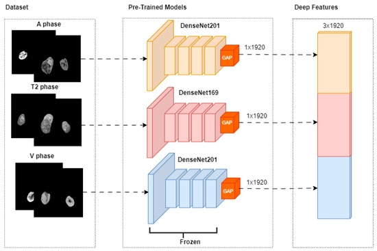 The fusion-based pipeline utilized in this study is presented in Figure 3. The pipeline incorporates three distinct magnetic resonance imaging (MRI) phases: A-phase, T2-phase, and V-phase. Each phase is processed through pre-trained models, specifically DenseNet201, DenseNet169, and DenseNet201, respectively. Feature extraction for each phase is performed using a Global Average Pooling (GAP) layer, resulting in deep feature vectors of size 1 × 1920 for each phase. These deep feature vectors are subsequently concatenated during the fusion phase to create a unified feature representation.