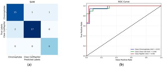 According to the confusion matrix for the SVM classifier presented in Figure 4, 17 out of 19 Clear Cell tumor samples were accurately classified, while two samples were misclassified as Chromophobe tumors. Upon examining the classification performance of the Chromophobe class, it was observed that 15 out of 17 samples were correctly identified. Among the remaining two samples, one was misclassified as Clear Cell, and the other as Papillary. This misclassification shows potential visual similarities or a limited set of discriminatory features between the Chromophobe class and the other tumor classes. Notably, all samples belonging to the Papillary tumor class were correctly classified, demonstrating the robustness of the model for this class. These findings indicate that the tumor class with the highest degree of inter-class confusion under a single-method, single-dataset approach was effectively distinguished using the proposed methodology.