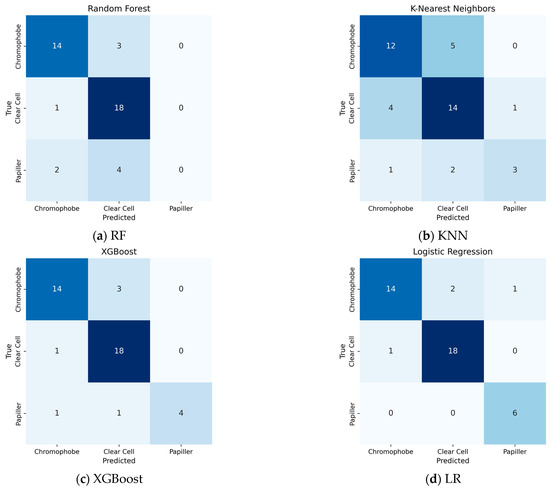 When traditional classification models other than SVM are evaluated (Figure 5), the confusion matrix obtained by the Logistic Regression algorithm is remarkable. Logistic Regression showed the most successful classification performance after the SVM model. This model managed to classify the Clear Cell tumor class with 94.7% accuracy, while this rate was 82.3% for the Chromophobe class. However, the discriminatory power of the model was significantly lower in the Papillary class, with only 66.6% accuracy. When the results of the K-Nearest Neighbor (KNN) algorithm are examined, it is observed that the model correctly classified Clear Cell tumors in 14 samples, but incorrectly classified 4 samples of Clear Cell tumors and assigned them to the Chromophobe class. This shows that Clear Cell and Chromophobe tumor classes may have structural similarities in terms of neighborhood relations that form the basis of the k-NN algorithm. On the other hand, the model was insufficient in distinguishing the Papillary class.