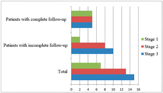 According to the International Staging System (ISS), seven patients were classified as stage 1, thirteen as stage 2, and fifteen as stage 3 at the time of diagnosis (Figure 1).
