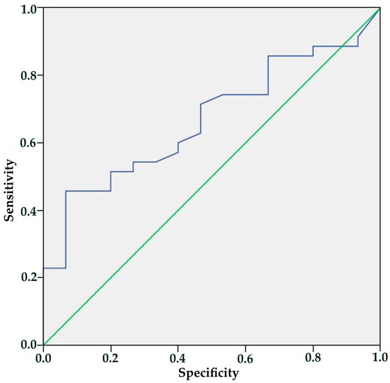 The ROC curve analysis showed that IL-10 and VEGF levels were not useful for diagnosis because there was no clear cut-off for VEGF, as patients and healthcare experts had similar average levels. The diagnostic cut-off value for IL-10 was determined to be 4.41 pg/dL, while exhibiting low sensitivity and specificity rates. The sensitivity and specificity were 71.4% and 53.3%, respectively. Figure 2 presents the ROC curve.