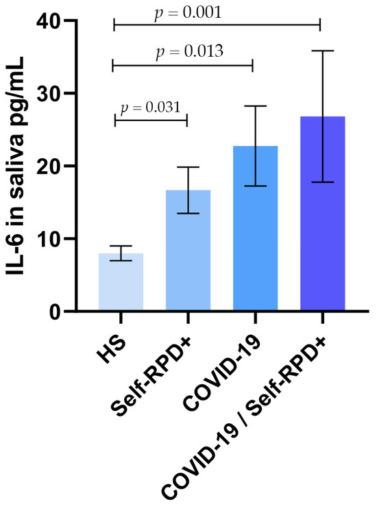 We found, as expected, that IL-6 levels in the COVID-19/Self-RPD+ group (26.8 pg/mL ± 43.4 pg/mL) were significantly higher than those in the COVID-19 only and Self-RPD+ groups (22.7 pg/mL ± 29.1 pg/mL and 16.6 pg/mL ± 14.9 pg/mL, respectively). Furthermore, as shown in Figure 1, IL-6 levels were significantly lower in the healthy subject (HS) group (7.9 pg/mL ± 3.4 pg/mL) compared to subjects with either Self-RPD+ or COVID-19 alone, as well as those presenting both conditions.