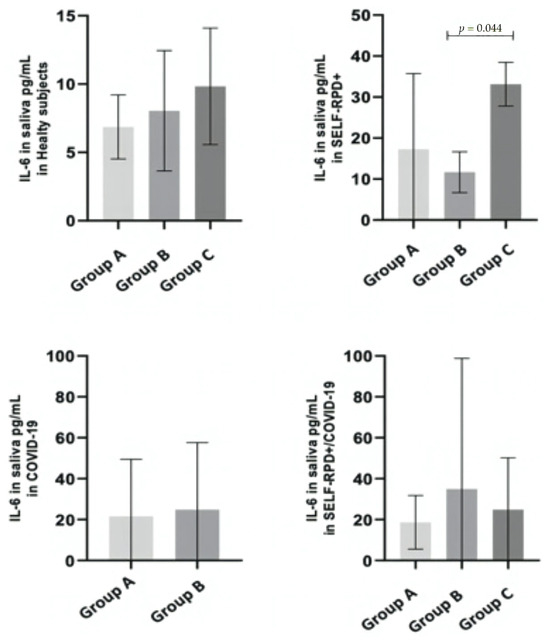 Patients in each study group (healthy subject, Self-RPD+, COVID-19, and COVID-19/Self-RPD+ groups) were categorized according to the number of symptoms as follows: Group A, one to five symptoms; Group B, six to ten symptoms; and Group C, eleven or more symptoms. Notably, in the Self-RPD+ group, a significant difference in IL-6 concentration was observed between patients with six to ten symptoms (Group B) and those with more than ten symptoms (Group C) (p = 0.044) (Figure 2).
