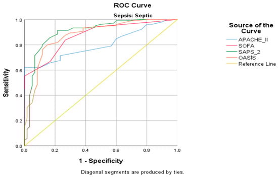 OASIS was created with a reduction in parameters required for calculation while keeping the prediction reliability in mind, by utilizing APACHE IV as the basis. Chen et al. stated that OASIS was simpler to calculate, with fewer laboratory parameters being required in estimation [15]. Zhu et al. reported that OASIS had a high association between 28-day mortality in patients with sepsis [31]. Huang et al. showed that OASIS was correlated with the prognosis of ICU patients with respiratory failure and also had prognostic value for mortality [32]. Our study confirmed this assumption, as OASIS was practical and accessible enough. However, a note of interest and perhaps limitation was that OASIS was the sole scoring system that included ICU admission duration and mechanical ventilation requirement history. These in-built requirements could have led to the assumption that OASIS is only valid for evaluating sepsis patients only in the ICU setting. In our study, the ROC analysis of all four scoring systems was statically significant and similar in shape, with SAPS II having the highest AUC, followed by OASIS.