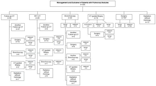 Figure 1. Management and outcome in all patients with pulmonary nodules. Surveillance CT or PET/CT scans were conducted in 24.4% (87/356) of the cases. As first diagnostic step, bronchoscopy, CT-guided transthoracic needle biopsy, or minimally invasive surgery was performed in 40 (11.2%), 19 (5.4%), and 197 (55.3%) cases, respectively. Stereotactic radiotherapy without verified histology was proposed in 13 (3.7%) patients. In the further course, histological diagnosis was established by bronchoscopy in 13.2% (47/356), CT-guided biopsy in 7.3% (26/356), or surgery in 65.2% (232/356) of the cases. Overall, a malignant diagnosis (histologically verified and clinically malignant) was found in 70.5% (251/356) of all patients.