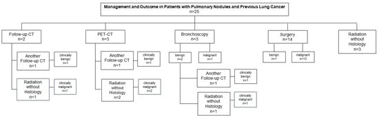 A total of 25 patients (25/356, 7%) had previously treated lung cancers. In this patient group with newly detected nodules (mean size 10.4 mm ± 4.3 mm) with a previous history of lung cancer, a follow-up CT scan was proposed in only two patients (2/25, 8%), while PET/CT scan was decided in three cases (3/25, 12%). Biopsies were obtained by bronchoscopy in three patients (3/25, 12%; one malignant, one benign, and one inconclusive result). Surgery was performed in 14 patients (14/25, 56%; 13 malignant results, including 12 lung cancers and 1 metastasis, 1 benign histology). Radiation based on individual risk assessment without histological confirmation was proposed in three cases (3/25, 12%). The details are presented in Figure 2.